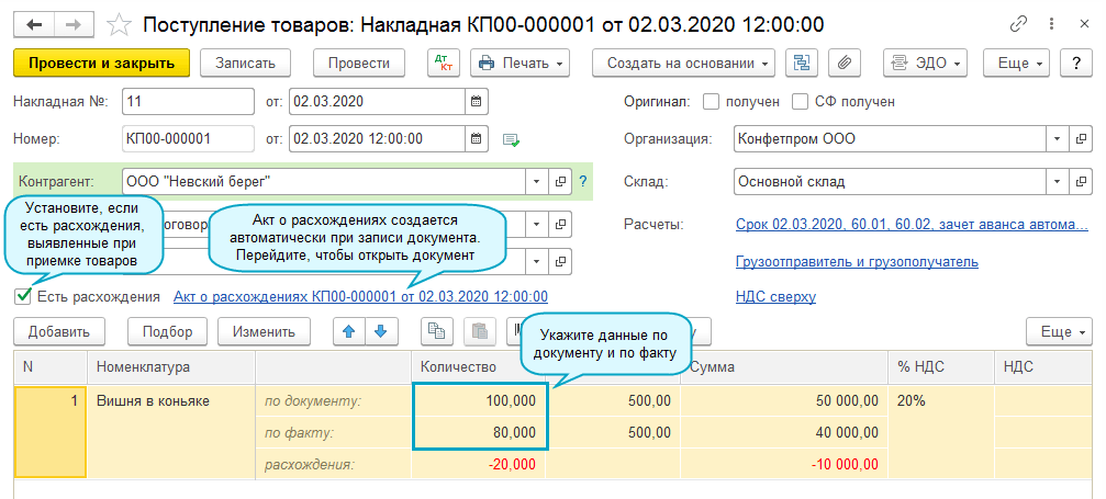 Добавлен новый документ Акт о расхождениях (ТОРГ-2). Документ создается автоматически из документа Поступление товаров (услуг) при наличии расхождений.