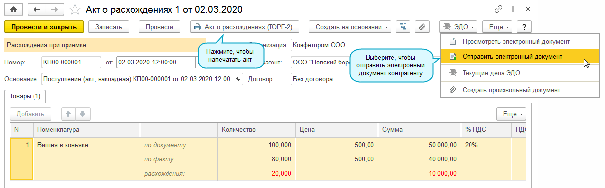На основании Акта о расхождениях (полученный) нужно создать Корректировку реализации и, при необходимости, корректировочный счет-фактуру. Корректировочные документы можно отправить покупателю по ЭДО.