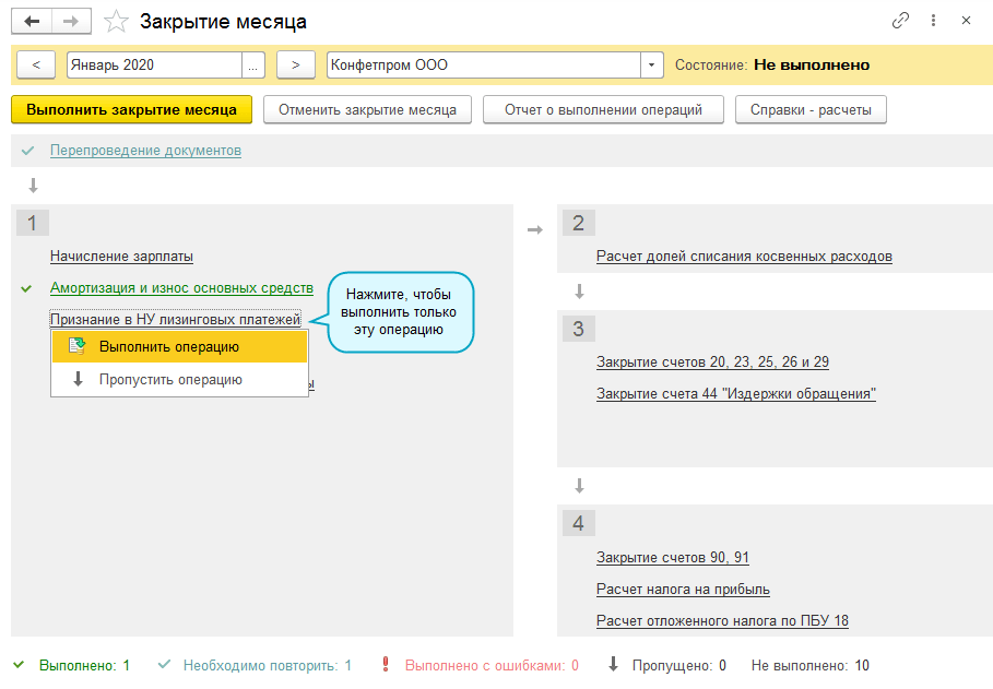 Предварительное закрытие отдельных операций не отменяет стандартное выполнение закрытия месяца, а используется только как дополнительная возможность.
