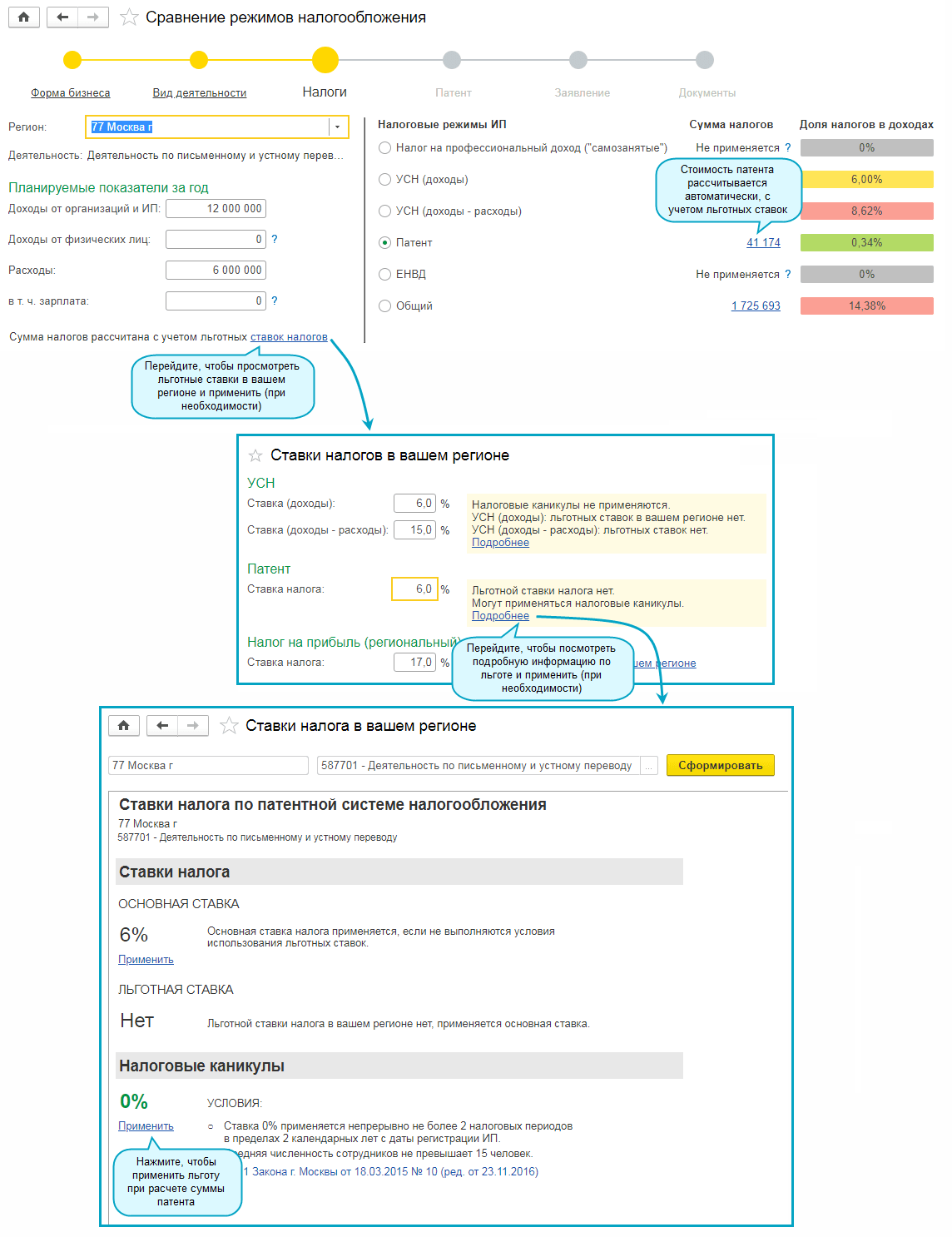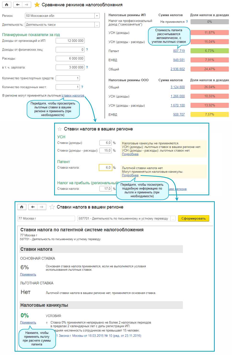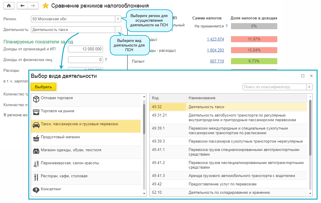 Стоимость патента при сравнении режимов налогообложения теперь рассчитывается автоматически с учетом особенностей регионального законодательства. Сервис доступен только для пользователей 1С:БухОбслуживания.
