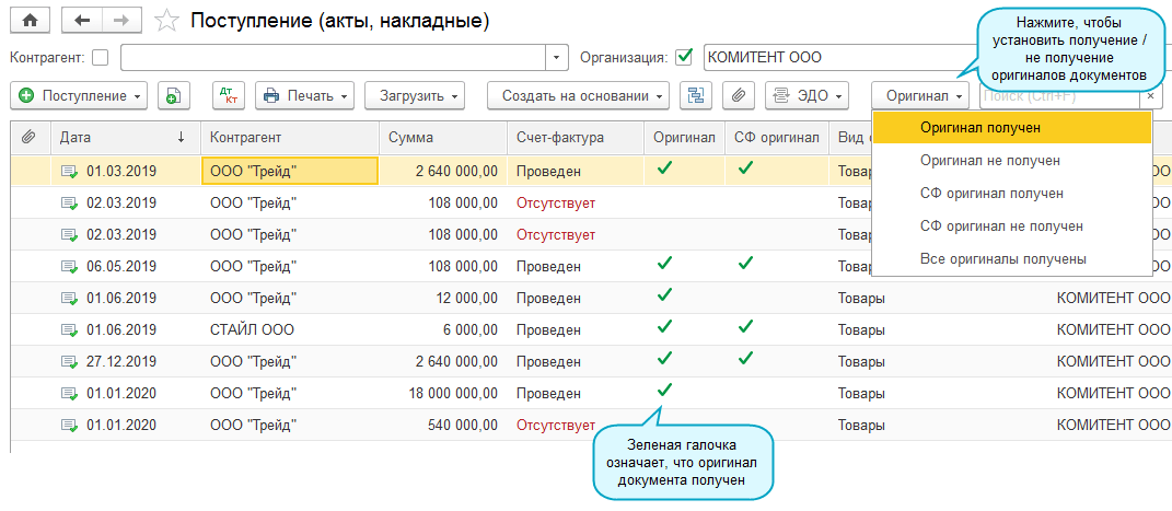 Добавлен флажок для отметки получения оригинала счета-фактуры поставщика. Флажок добавлен в документы: