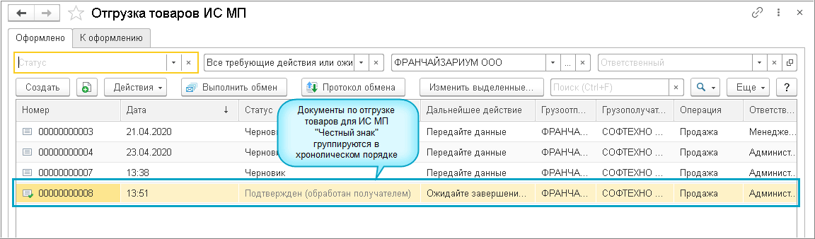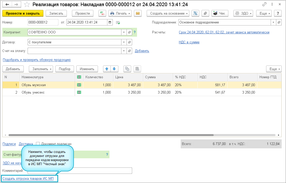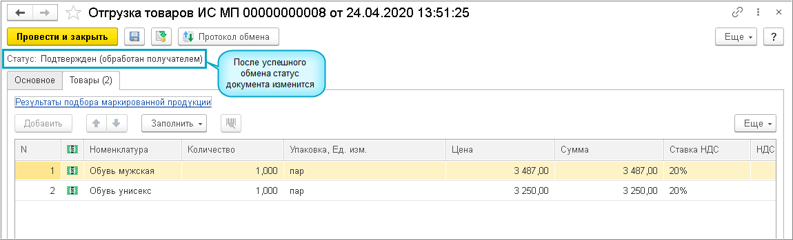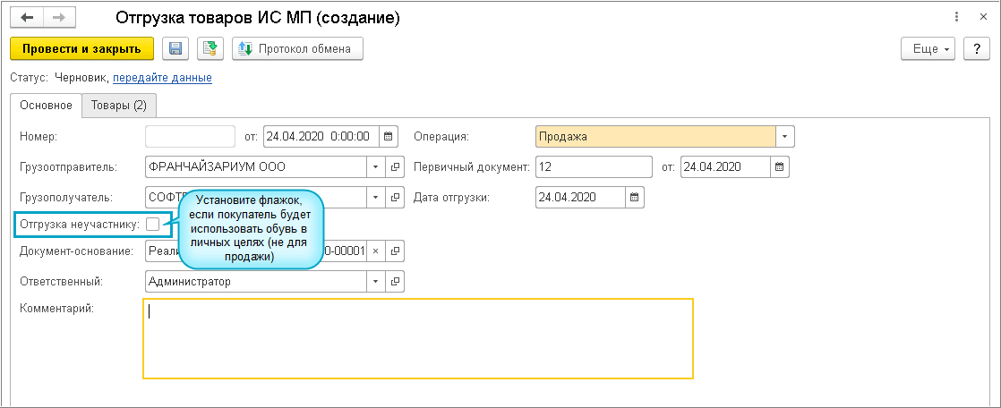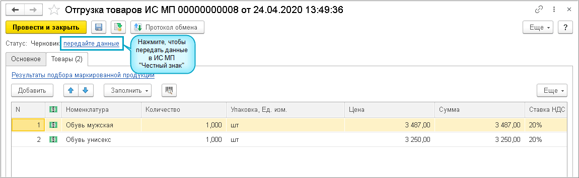 Добавлена возможность прямого обмена для передачи кодов маркировки в ИС МП "Честный знак" в документе Реализация, когда между участниками не используется ЭДО.