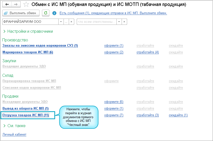 Полный интерфейс: меню "Администрирование - Обмен с ИС МП (обувь, табак...)".