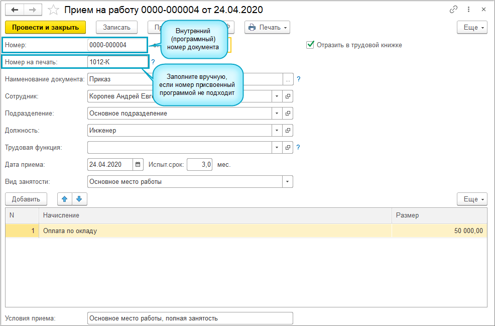 Добавлена возможность указать номер приказа для печатной формы кадровых документов: Прием на работу, Увольнение, Кадровый перевод. Номер на печать будет отражен в форме СЗВ-ТД, если указан в кадровом документе.