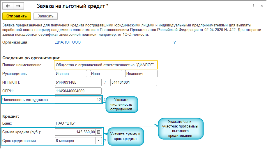 В соответствии с постановлением Правительства Российской Федерации от 02.04.2020 № 422 реализована возможность отправки заявок на льготный кредит на неотложные нужды для поддержки и сохранения занятости непосредственно из программы "1С".