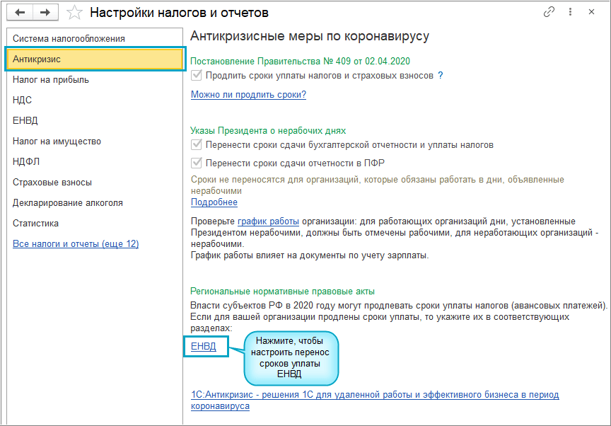 Простой интерфейс: меню "Налоги - Настройка налогов и отчетов - Антикризис".