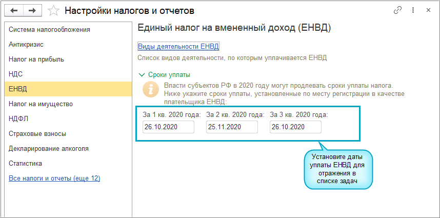 Добавлена возможность установить сроки уплаты ЕНВД в соответствии с нормативно-правовыми актами органов государственной власти субъектов РФ (Федеральный закон от 01.04.2020 года № 102-ФЗ).