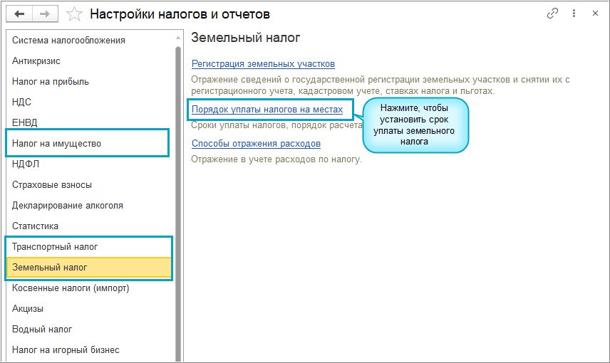 Простой интерфейс: меню "Налоги - Настройка налогов и отчетов".