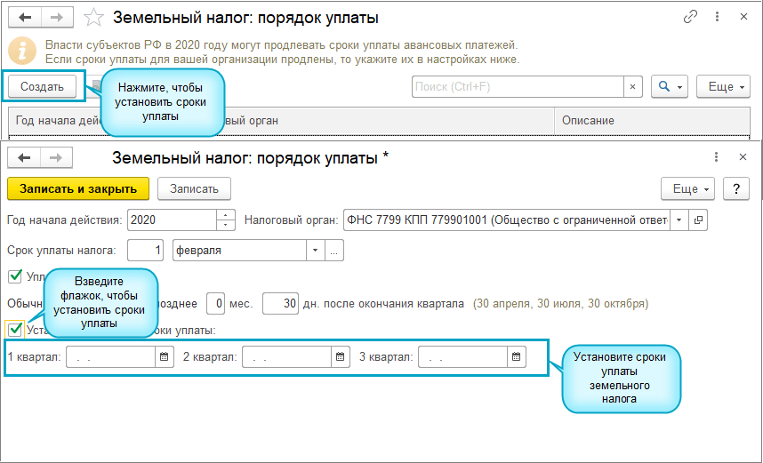 Добавлена возможность установить сроки уплаты местных налогов в соответствии с нормативно-правовыми актами местных органов власти РФ, в связи с пандемией коронавирусной инфекции. (Федеральный закон от 01.04.2020 года № 102-ФЗ).