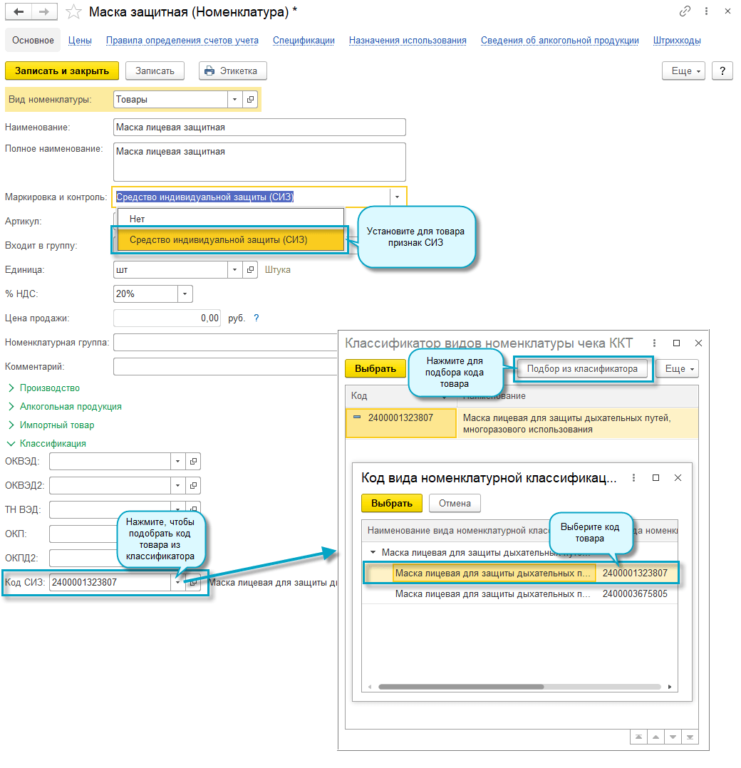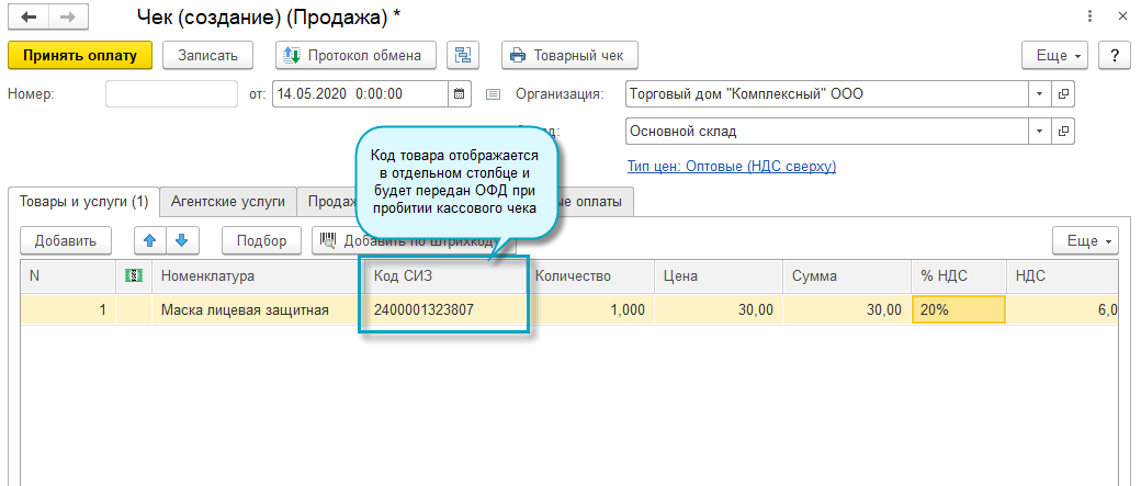 Добавлена возможность указать код товара в кассовом чеке для средств индивидуальной защиты (СИЗ) (Постановление Правительства РФ от 16.04.2020 № 521).