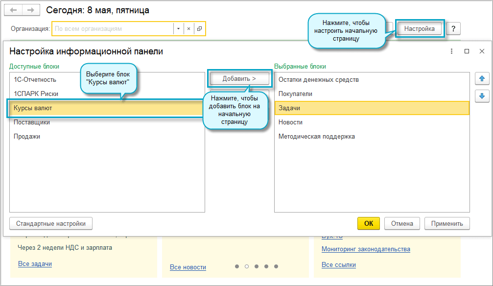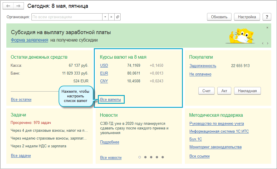 Добавлена возможность отображения курсов валют на начальной странице. Данный функционал доступен, если в справочнике валют используется хотя бы одна валюта, кроме российского рубля.