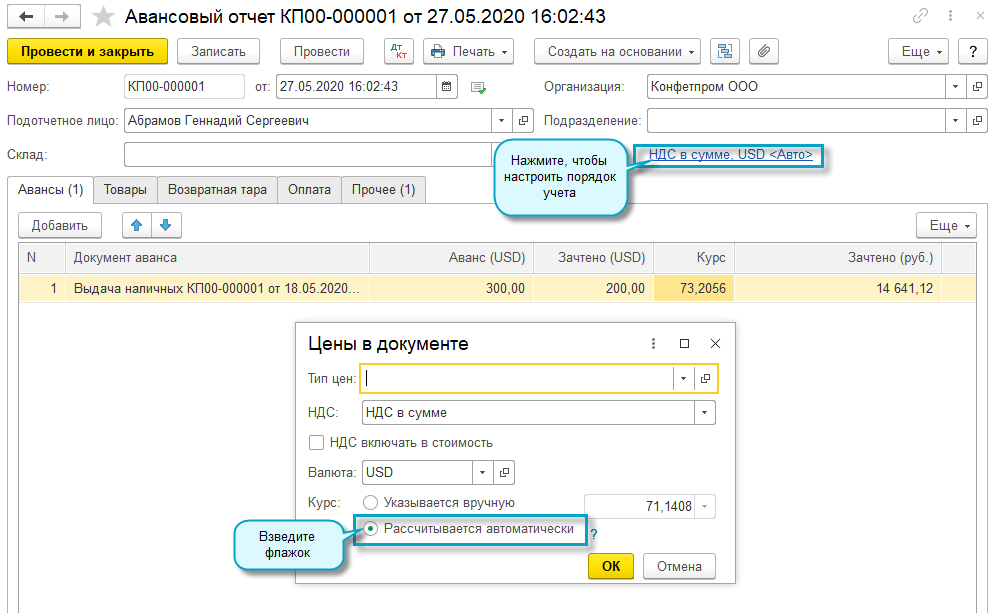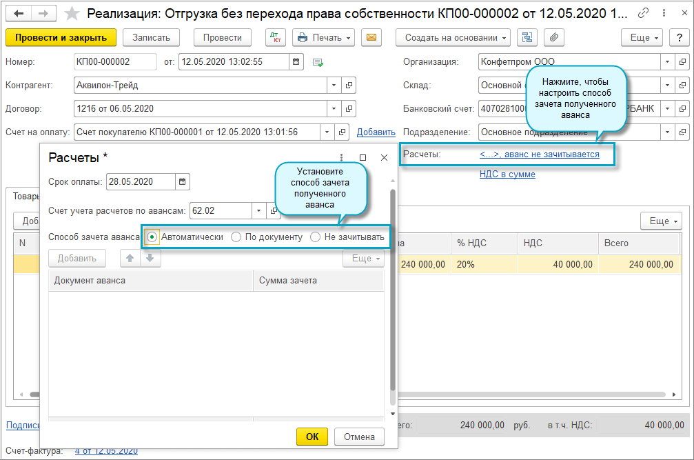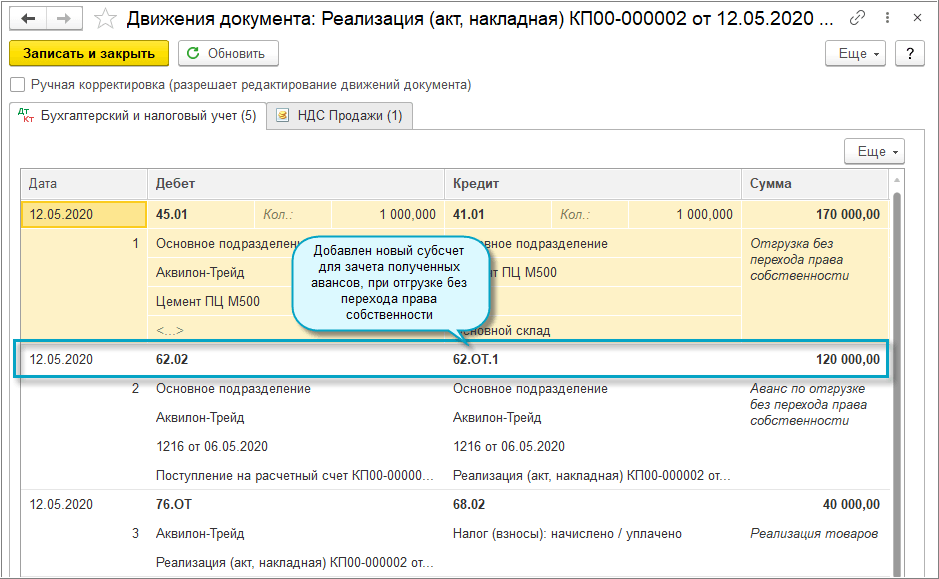 Добавлена возможность зачитывать полученные авансы при отгрузке без перехода права собственности. НДС по таким зачтенным авансам принимается к вычету в конце квартала автоматически.