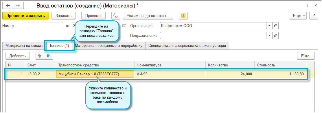 Добавлена возможность ввода остатков топлива в баке автомобиля через помощник ввода начальных остатков.