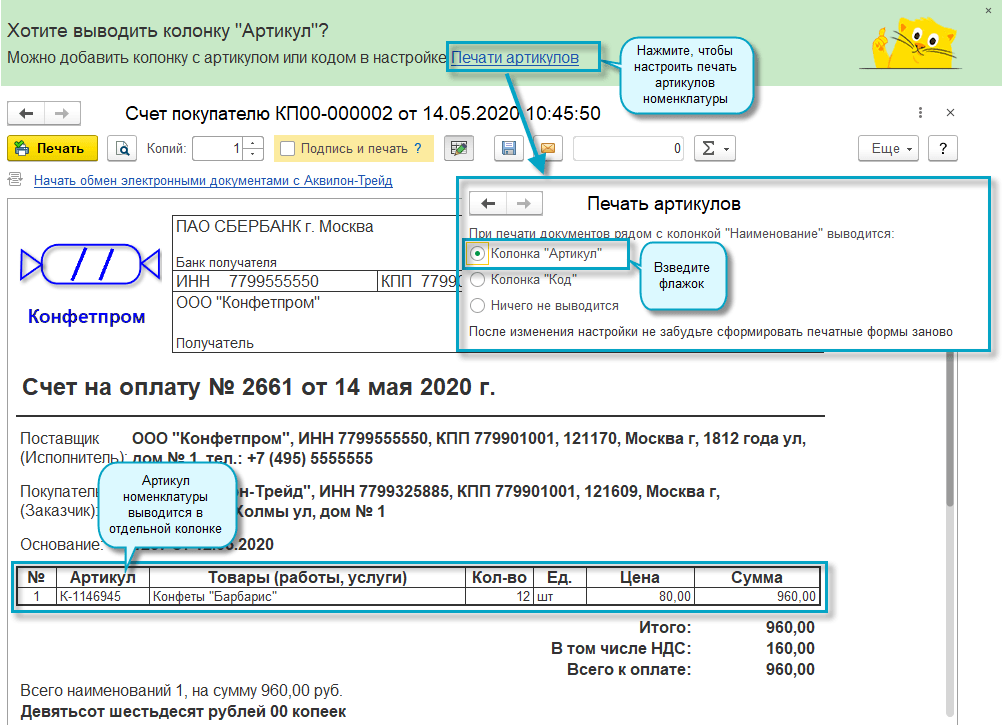 Добавлена возможность быстрой настройки вывода на печать артикула номенклатуры в документах Счет покупателю, Реализация (акт, накладная), УПД.