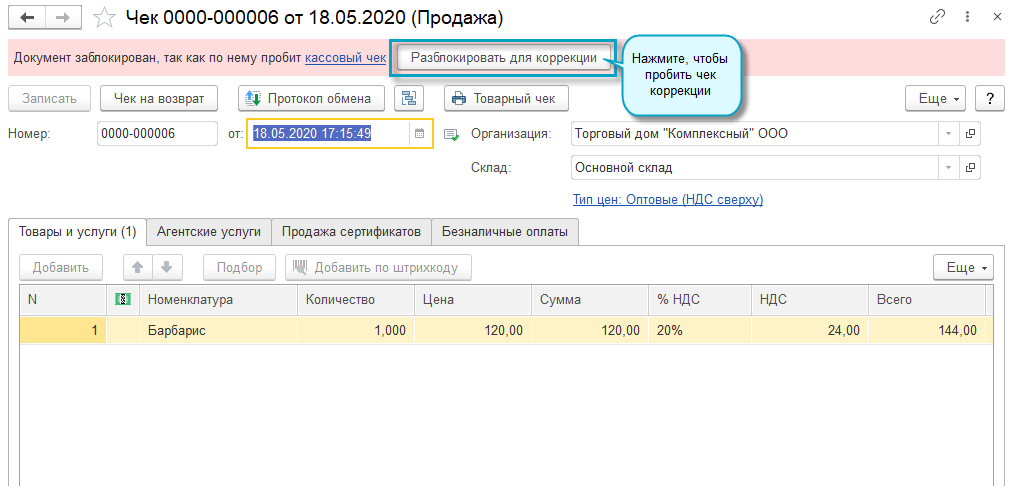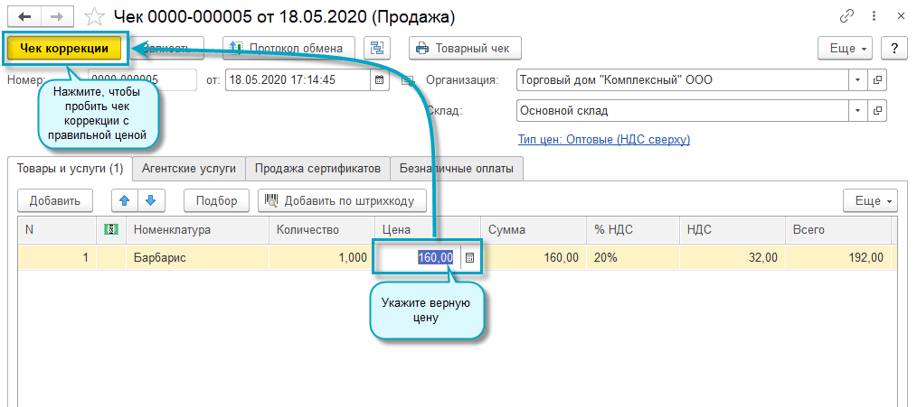ООО Торговый дом "Комплексный" осуществил продажу в розницу 1 кг конфет "Барбарис". Кассовый чек пробит с указанием цены 120 руб./кг. Верная цена 160 руб./кг. Кассир исправил ошибку, пробив кассовый чек коррекции с указанием правильной цены за товар.