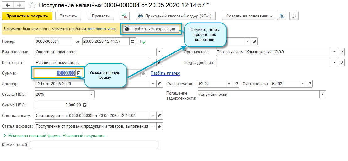 ООО Торговый дом "Комплексный" принял предварительную оплату 50% в сумме 18 000 руб. за диван. Кассовый чек пробит на сумму 180 000 руб. Кассир исправил ошибку, пробив кассовый чек коррекции с указанием верной суммы 18 000 руб.