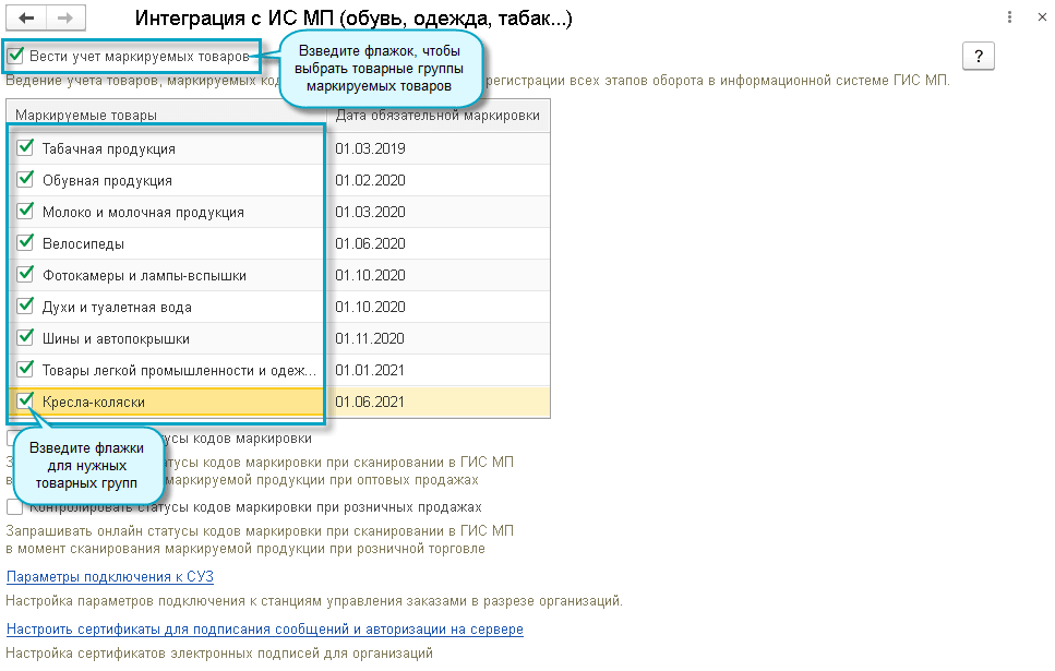 Добавлены новые товарные группы для обязательной маркировки на всех этапах оборота в информационной системе "Честный знак". Необходимо установить настройки в программе для начала работы с новыми видами товаров, подлежащих обязательной маркировке.