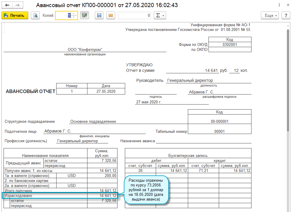 Командировочные расходы в иностранной валюте отражаются по курсу на дату выдачи аванса подотчетному лицу.