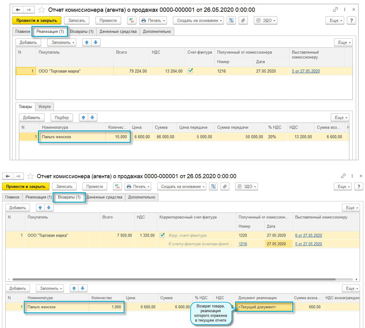 Добавлена возможность отразить возврат товаров, реализация которых отражена в этом же отчете комиссионера.