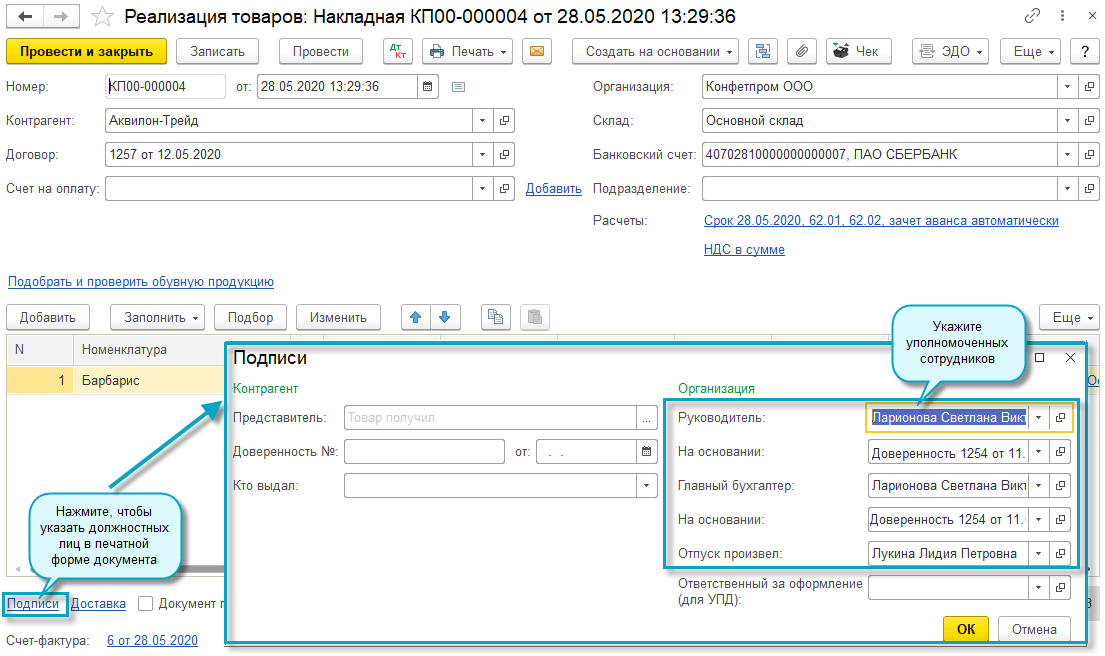 Добавлена возможность выводить на печать факсимиле подписи уполномоченного сотрудника или физического лица в печатных формах документов.