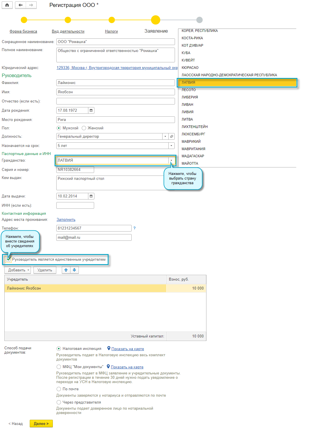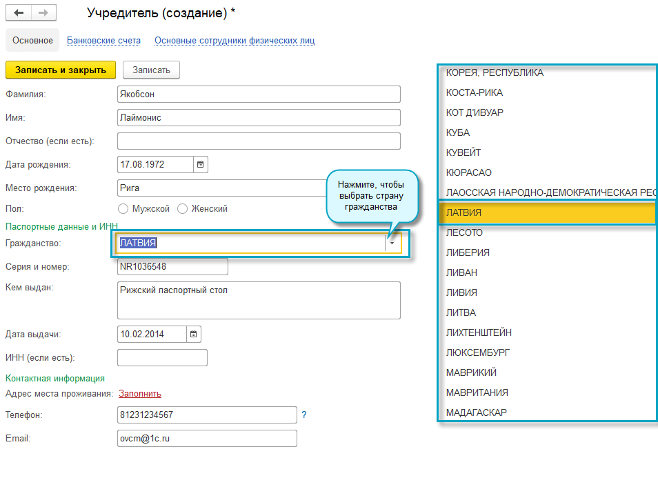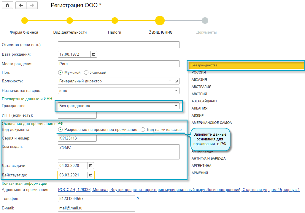 В форме регистрации ООО добавлена возможность указать страну гражданства рукодителя/учредителя, данные иностранного паспорта, данные вида на жительство или разрешения на временное проживание. Сервис доступен только для пользователей 1С:БухОбслуживание.
