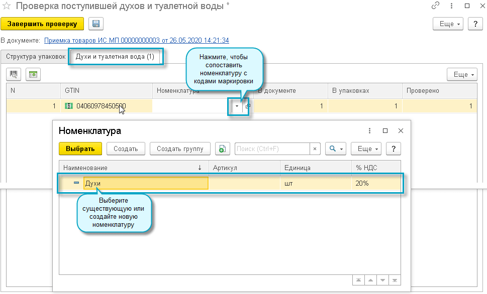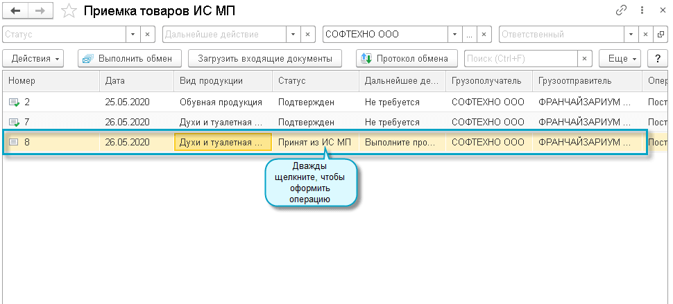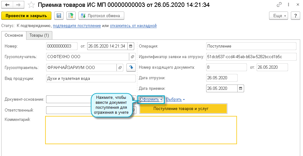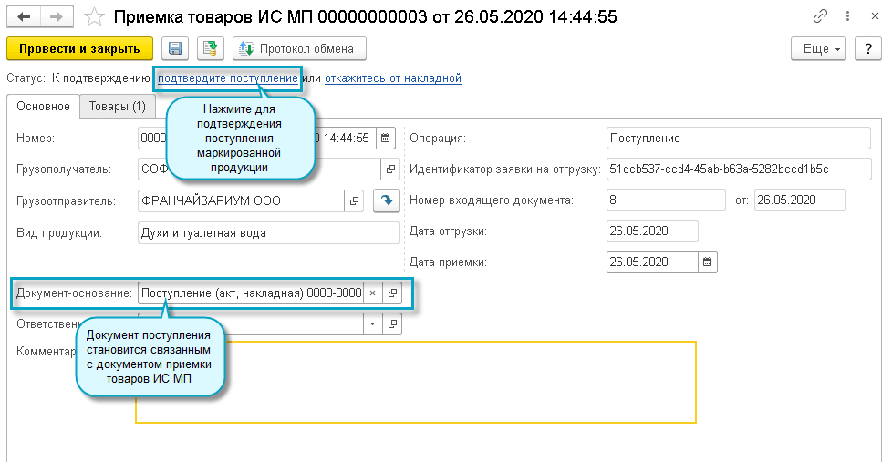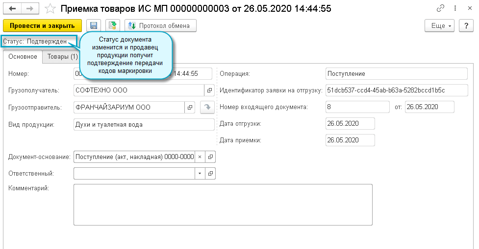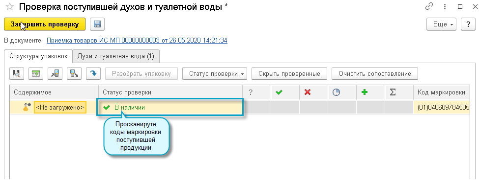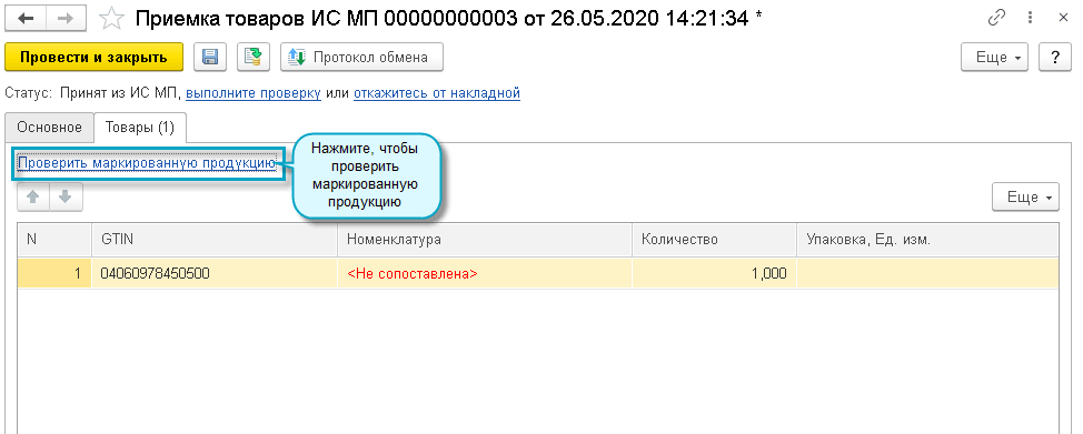 Покупатель загружает из ИС МП документ "Приемка товаров ИС МП" и сверяет с ним полученные коды маркировки.