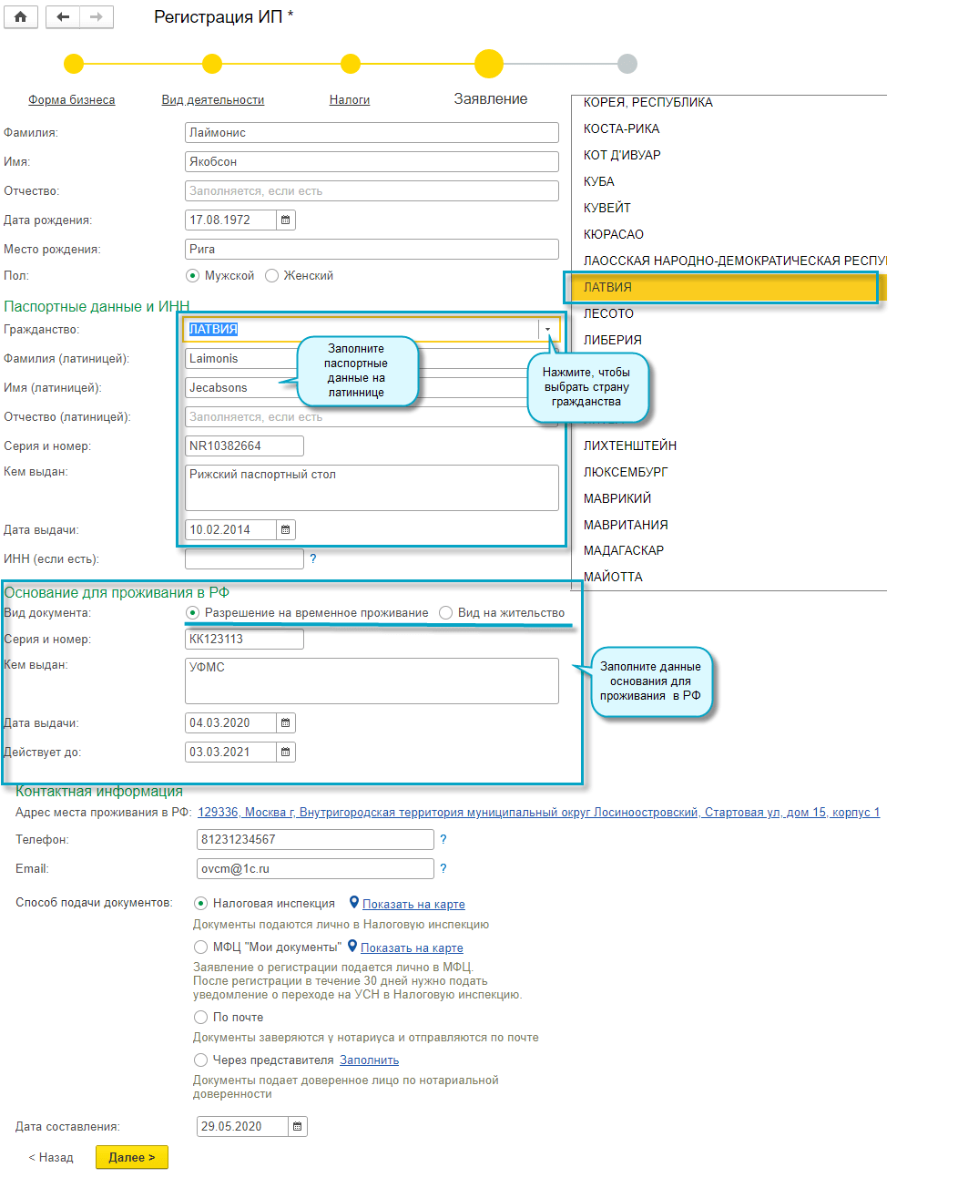 В форме регистрации ИП добавлена возможность указать страну гражданства рукодителя/учредителя, данные иностранного паспорта, данные вида на жительство или разрешения на временное проживание. Сервис доступен только для пользователей 1С:БухОбслуживание.
