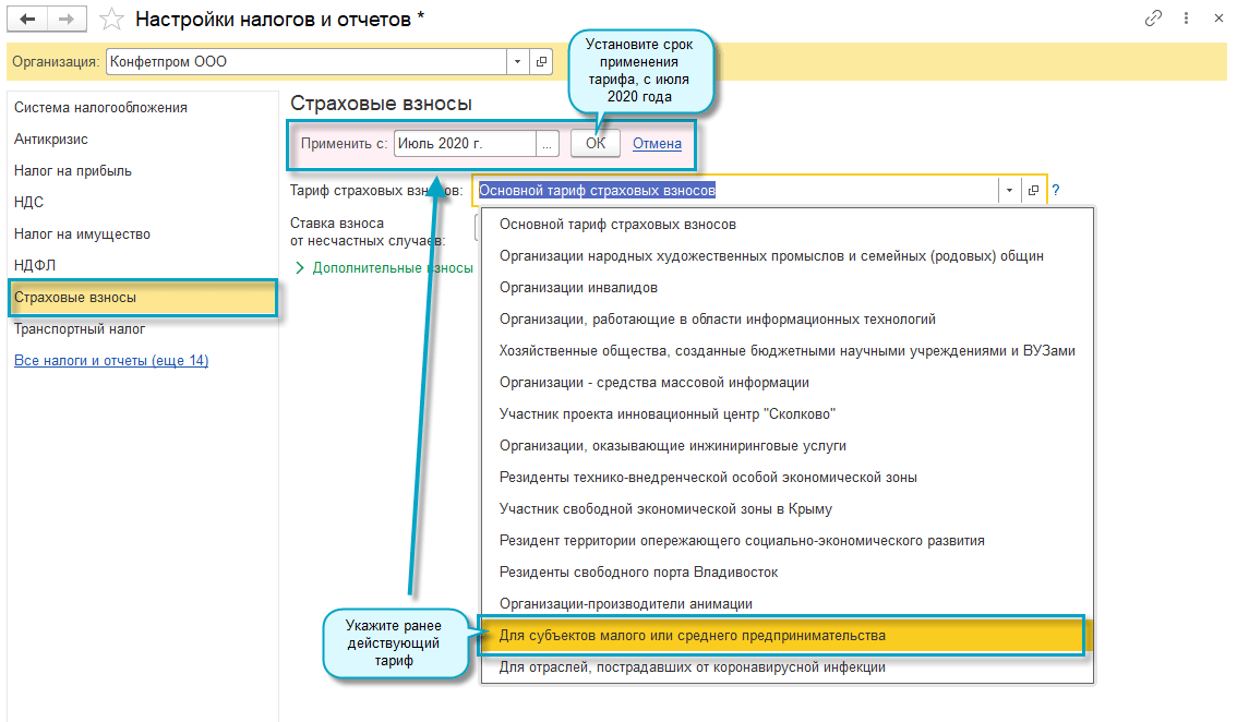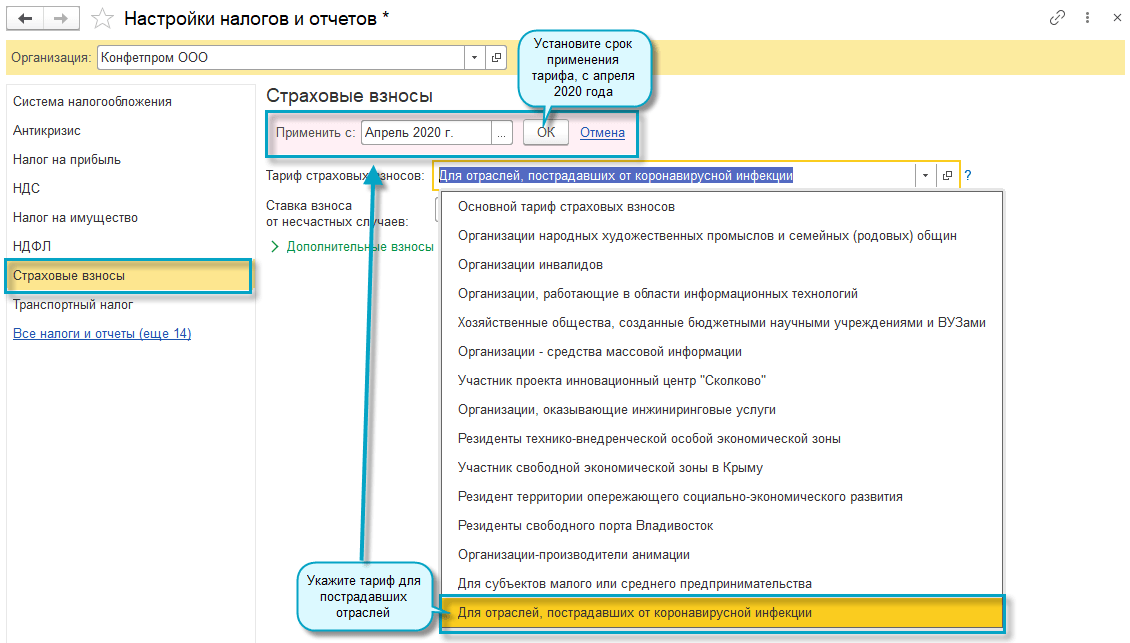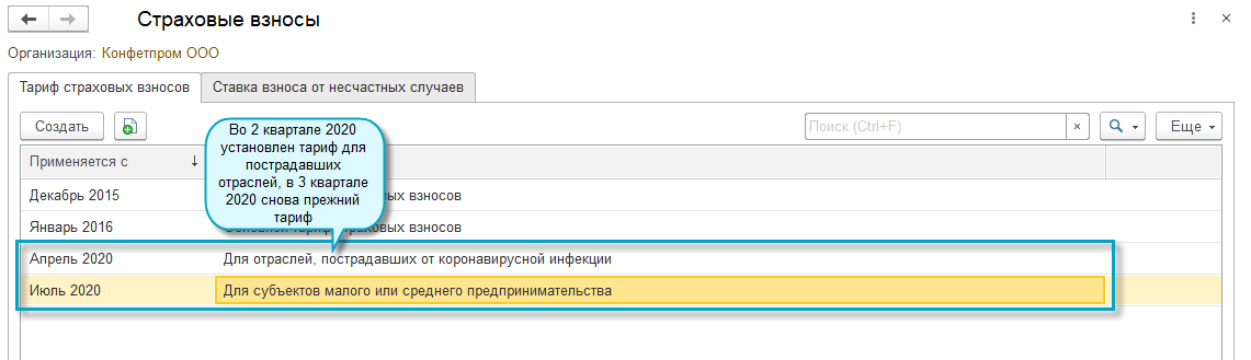 Добавлена возможность установить тариф страховых взносов за 2 квартал 2020 года для организаций и ИП малого и среднего бизнеса, занятых в отраслях наиболее пострадавшим от коронавирусной инфекции. Организации должны быть включены в единый реестр субъектов малого и среднего предпринимательства на основании налоговой отчетности за 2018 год (Законопроект № 959325-7 https://its.1c.ru/db/newscomm#content:469332:hdoc).