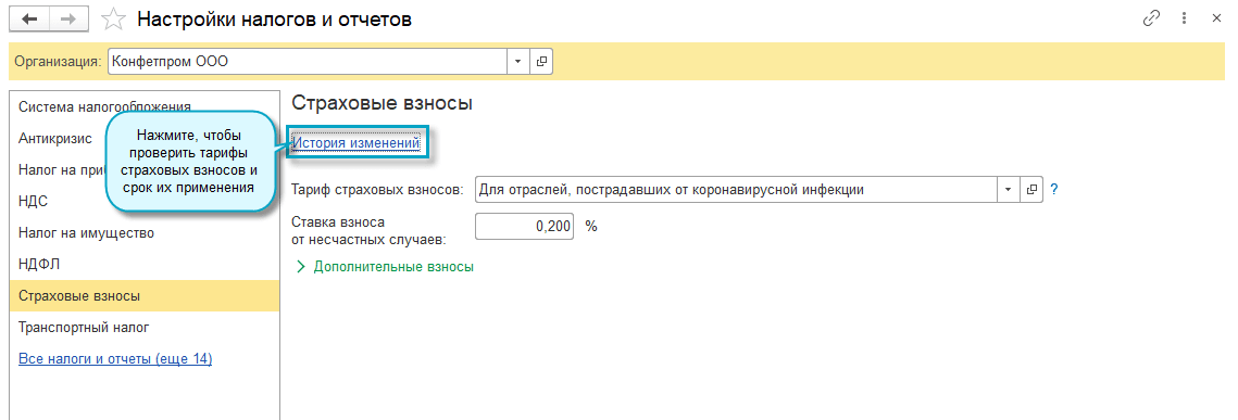Простой интерфейс: меню "Налоги - Настройка налогов и отчетов - Страховые взносы".