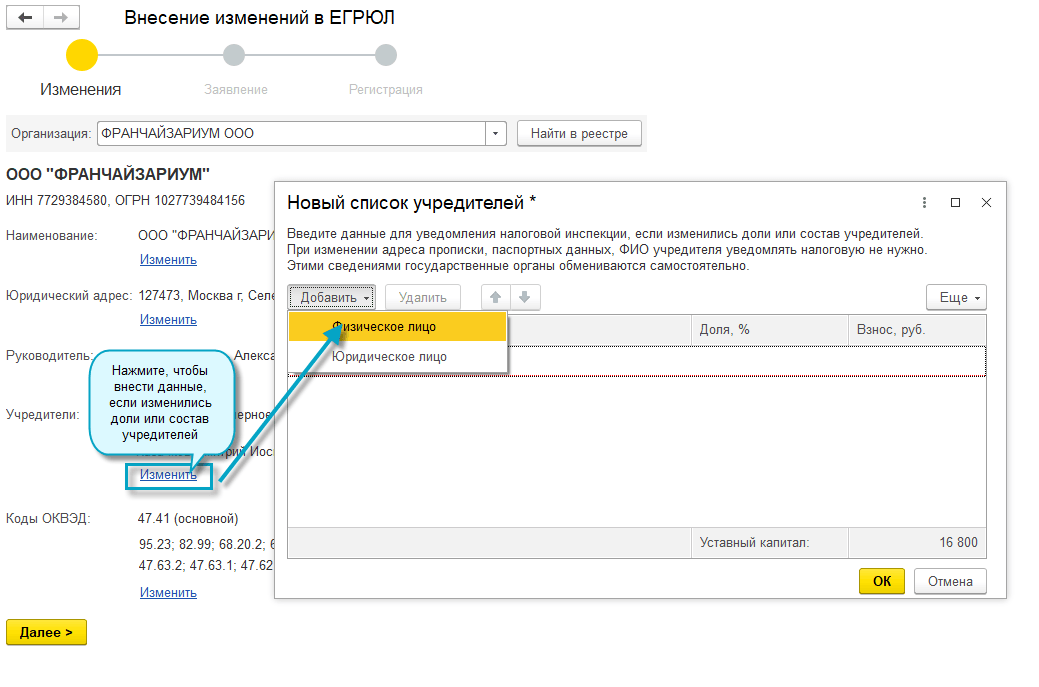 Полный интерфейс: меню "Главное - Внесение изменений в ЕГРЮЛ, ЕГРИП".