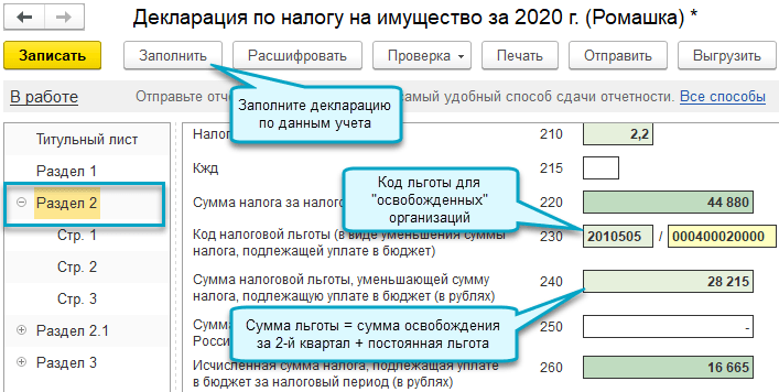 Создайте декларацию по налогу на имуществу, транспортному налогу или земельному налогу и заполните ее по данным учета.