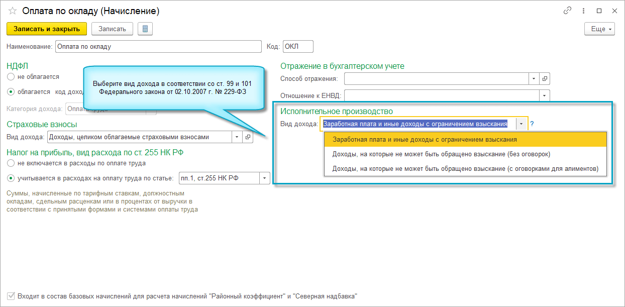 Для этого в виде начисления необходимо выбрать соответствующий вид дохода исполнительного производства.