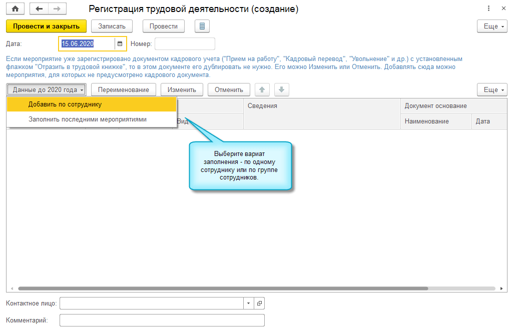 Расширены возможности автоматического заполнения документа данными до 2020 г. Можно регистрировать данные по всем сотрудникам, по группе сотрудников или по отдельным сотрудникам.