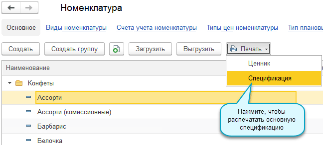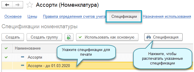 Полный интерфейс: "Справочники - Товары и услуги - Номенклатура - Карточка номенклатуры - закладка Спецификации".