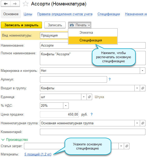 Добавлена возможность печати спецификации сырья и материалов на изготовление продукции.
