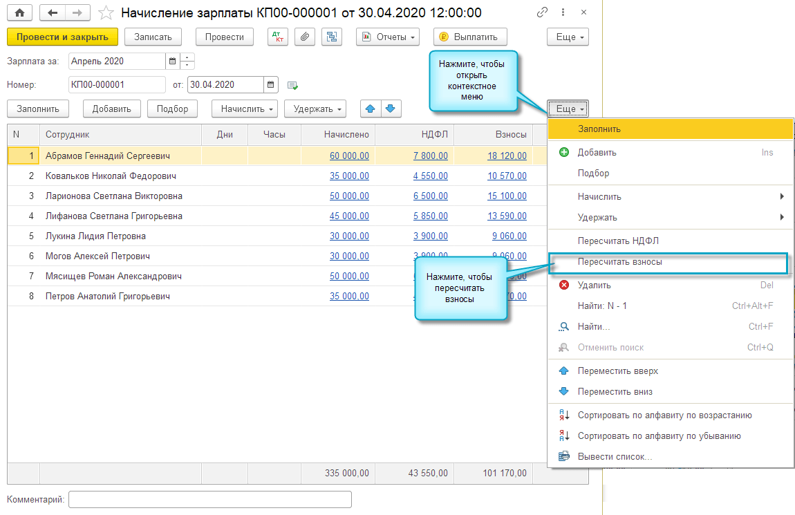 Если есть сотрудники, у которых в апреле, мае или июне (если взносы за июнь уже посчитаны) доходы превысили какую-либо предельную величину, то необходимо пересчитать взносы непосредственно в этом документе начисления зарплаты.