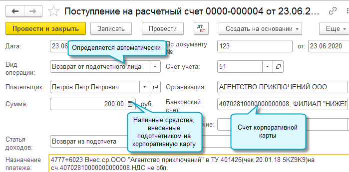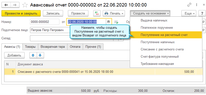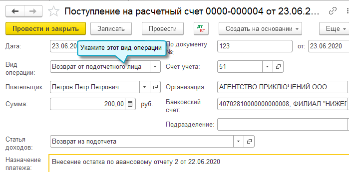 В Поступление на расчетный счет добавлена возможность отражать возврат безналичных денежных средств от подотчетного лица.