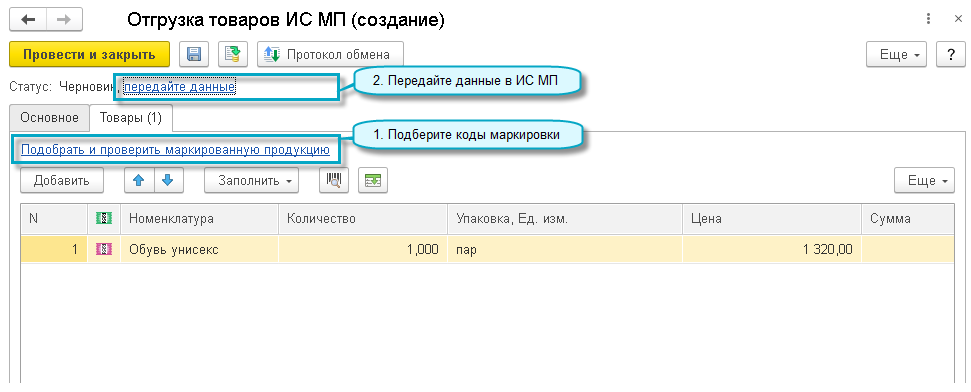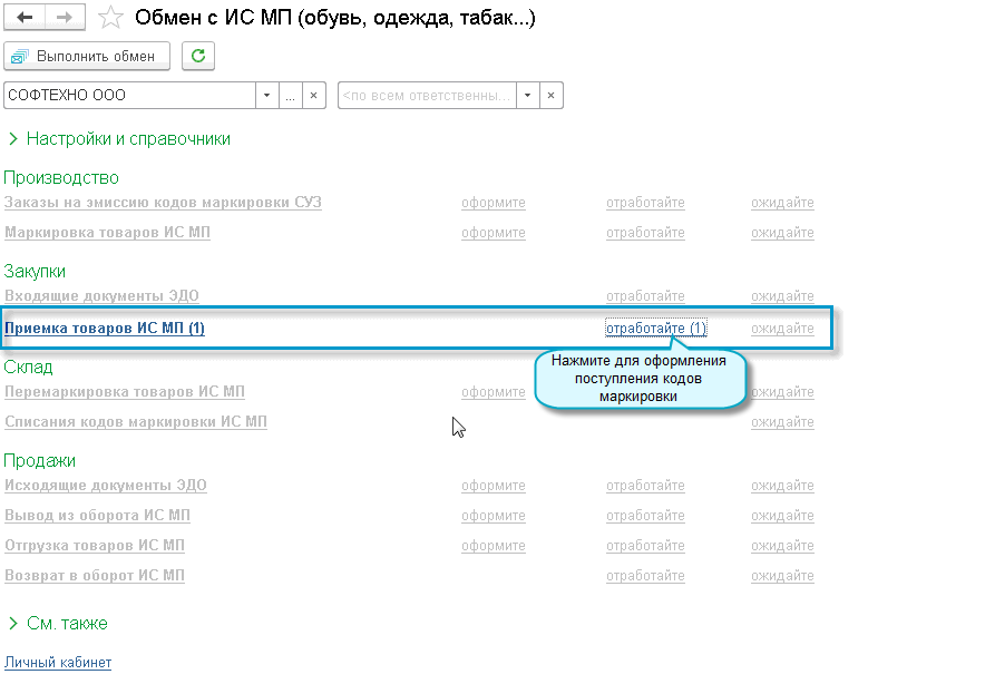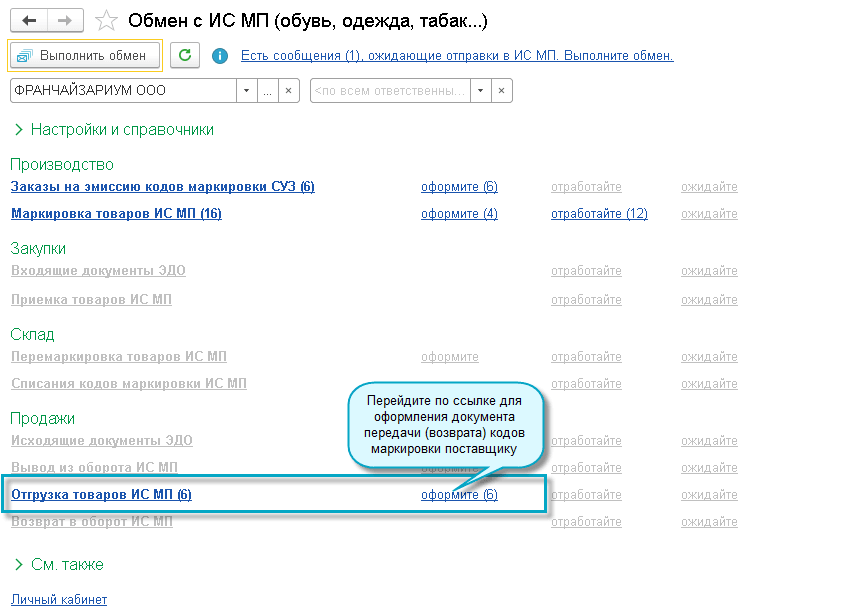 Полный интерфейс: меню "Администрирование - Обмен с ИС МП (обувь, табак...)".