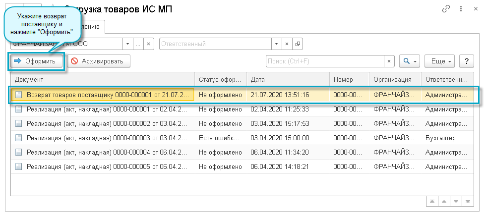 Добавлена возможность передачи кодов маркировки в ИС МП "Честный знак" по операциям, оформленным документом "Возврат товаров поставщику".