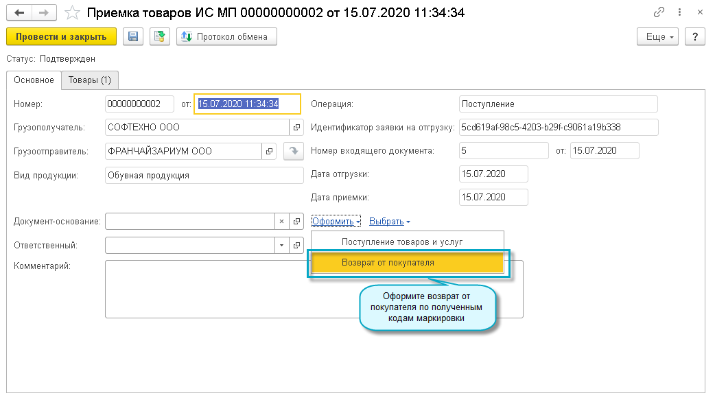 Добавлена возможность получения кодов маркировки из ИС МП "Честный знак" в документ "Возврат товаров от покупателя".