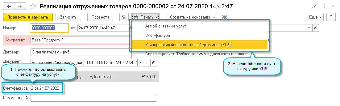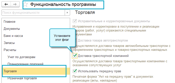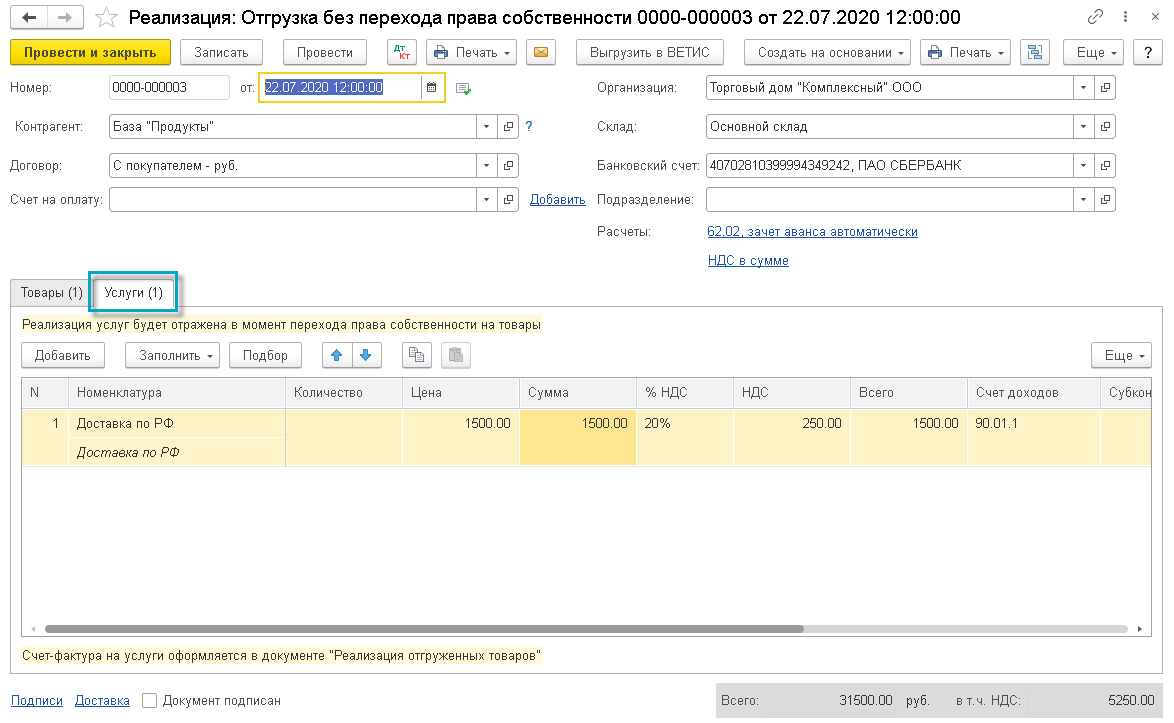 Добавлена возможность добавлять услуги в отгрузку без перехода права собственности. Например, для отражения услуг по доставке, если право собственности на товары переходит после передачи товаров покупателю.