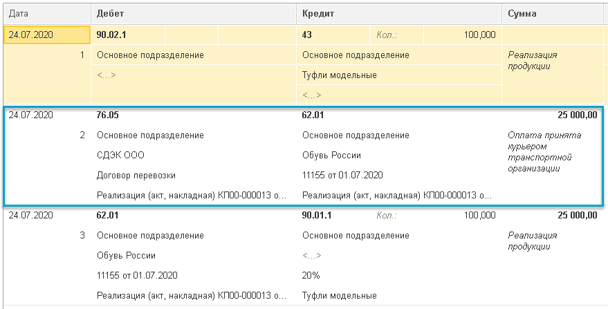 при проведении документа, в котором выбран вид доставки "Доставка с оплатой при получении" добавляется проводка переноса долга