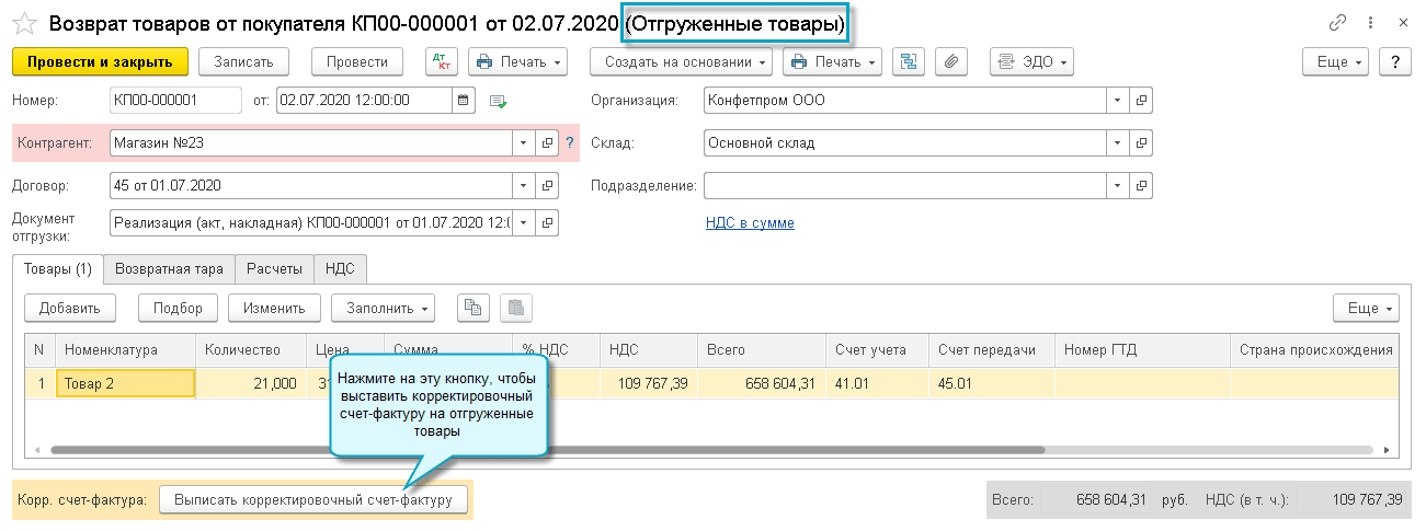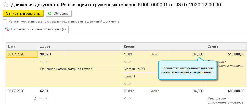Если покупатель отказался от части отгруженных товаров, то при проведении документа Реализация отгруженных товаров в количество и сумма заполняются с учетом возвращенных товаров.