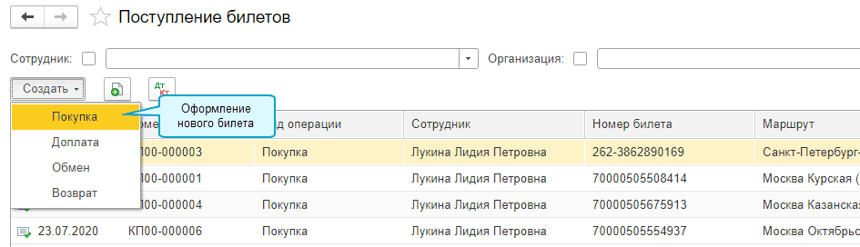Полный интерфейс: меню "Покупки - Поступление билетов"