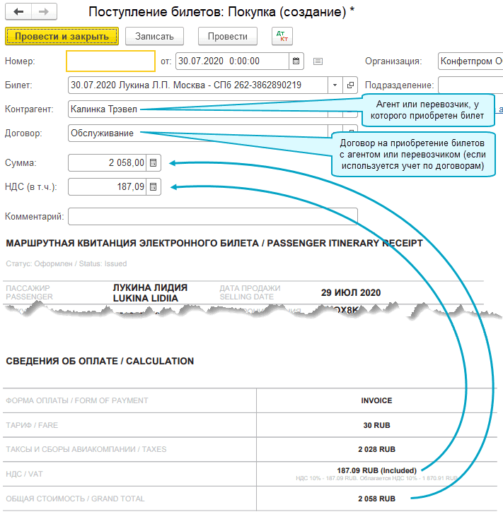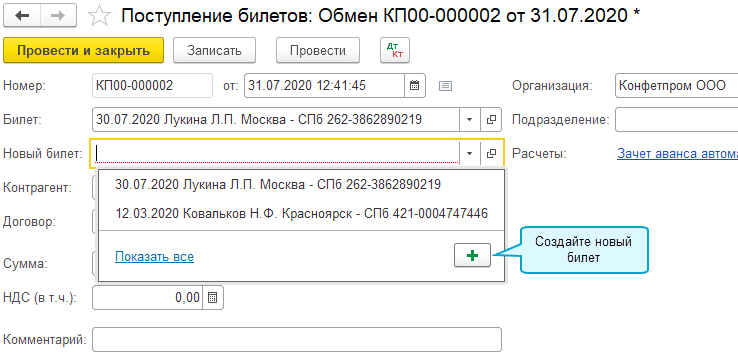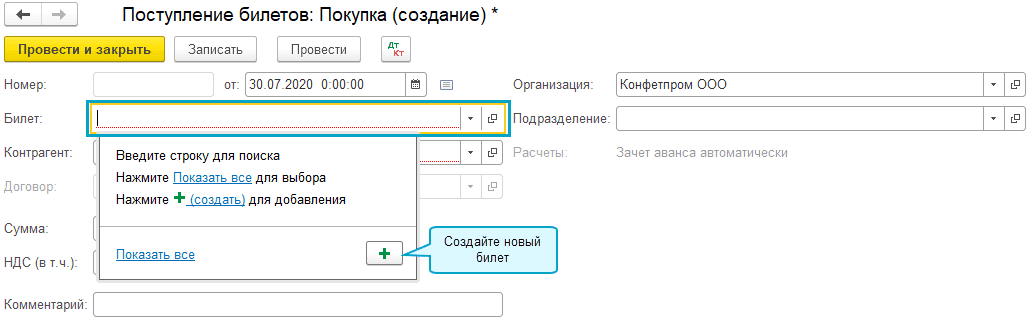 После записи нового билета заполните оставшиеся поля покупки билета: