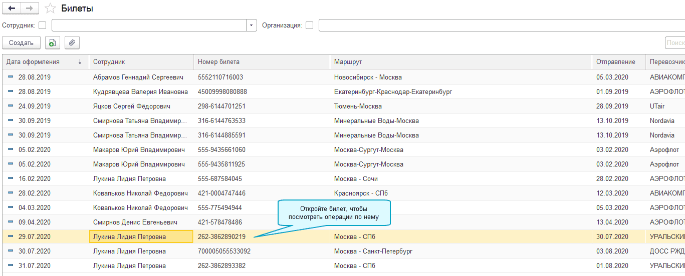 Любой приобретенный билет, а также все операции с ним можно найти через справочник Билеты: