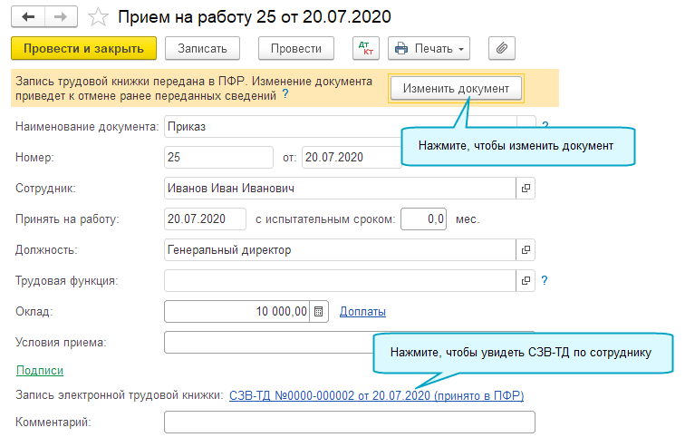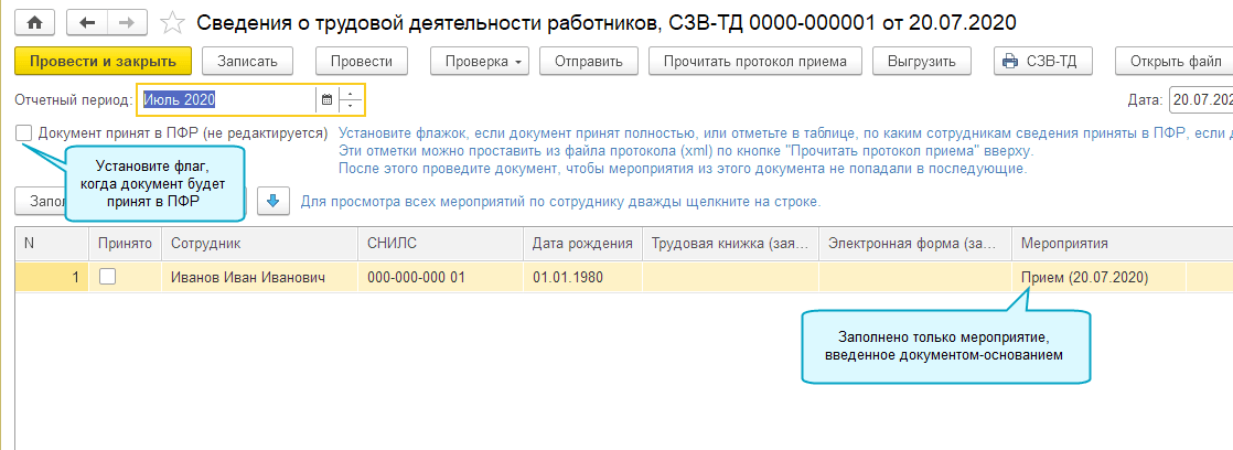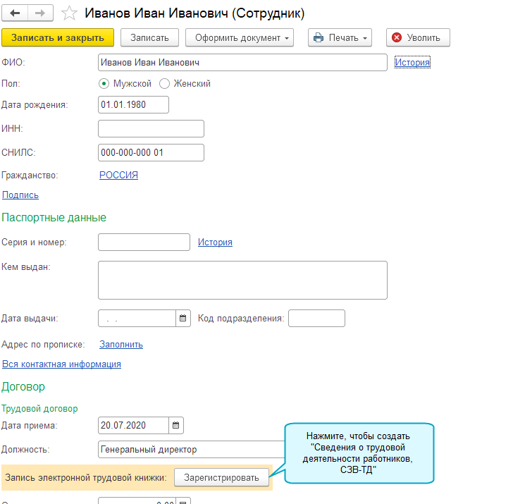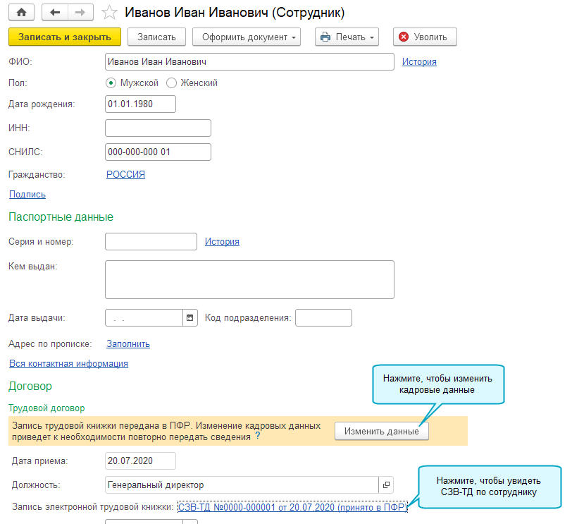 Добавлена возможность регистрировать и отправлять в ПФР форму СЗВ-ТД из справочника Сотрудники.