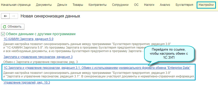 Полный интерфейс: меню "Администрирование - Настройки программы - Синхронизация данных - Настройки синхронизации данных - Обмен данными с другими программами".
