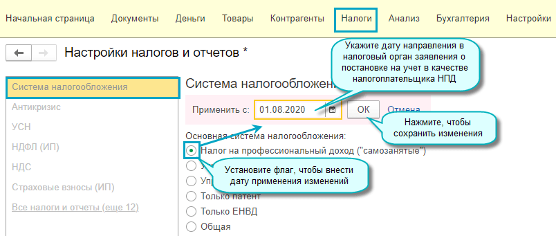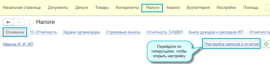 Полный интерфейс: меню "Главное - Настройки - Налоги и отчеты - Настройка налогов и отчетов - Система налогообложения".