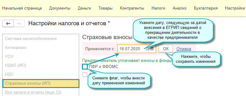 При закрытии ИП сделайте следующие настройки налогов и отчетов: